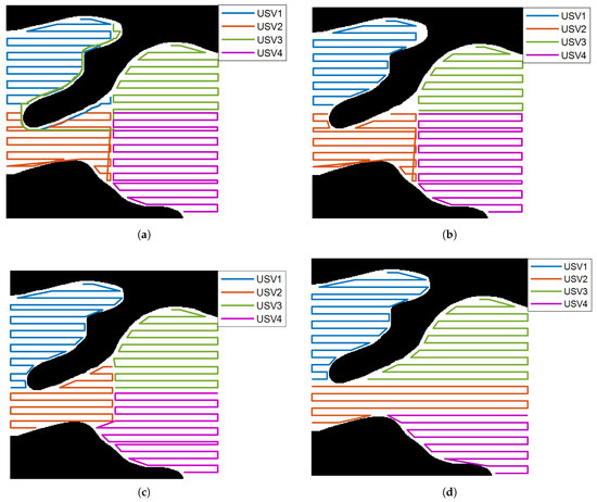 As shown in Figure 3c, USV cooperative planning is affected by the independent coverage update process of each partition, so potential exchange areas may appear. In this scenario, USV1, starting in the left region, may need to go around an obstacle shortly after beginning its route, until USV1 exceeds the lower left bound of the region or falls into a local optimum from then on. The green-dotted area is still underdeveloped coverage. This strategy allocates the green area to USV2 on the right to ensure that the USV2 in this area can continue to perform additional coverage operations. If the exchange sequence is , then the mission update method of the USVs is as follows:
