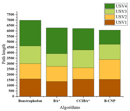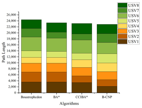 It can be seen from Table 3 that the coverage path lengths of the B-CNP algorithm in Scenario 1 are 6.08%, 1.89%, and 0.89% less than those of the Boustrophedon algorithm, BA* algorithm, and CCIBA* algorithm. And the coverage rates are 1.25%, 3.74%, and 1.22% higher than these three algorithms. The coverage path lengths of the B-CNP algorithms in Scenario 2 are 8.43%, 1.38%, and 1.52% less than those of the Boustrophedon algorithm, BA* algorithm, and CCIBA* algorithm. And the coverage rates are 1.26%, 3.76%, and 1.22% higher than these three algorithms. The coverage path lengths of the B-CNP algorithm in Scenario 3 are 10.25%, 5.49%, and 1.48% less than those of the Boustrophedon algorithm, BA* algorithm, and CCIBA* algorithm. And the coverage rates are 2.06%, 6.25%, and 0.62% higher than these three algorithms. Based on the data provided, it becomes evident that as the scene complexity escalates, the B-CNP algorithm exhibits enhanced performance when compared to both the BA* algorithm and the Boustrophedon algorithm. This improvement is attributed to the B-CNP algorithm’s flexibility, as it does not adhere to a fixed task area. This adaptability allows unmanned boats to adjust mission areas through communication, thereby mitigating the need for unnecessary backtracking paths. At the same time, the advantages of the B-CNP algorithm compared to the CCIBA* algorithm are relatively stable.