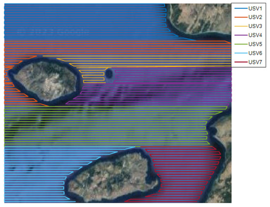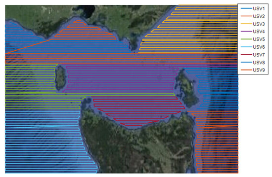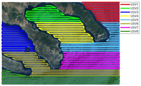 Many studies have focused on the coverage search algorithms of single vessels, but a single vessel is vulnerable to limitations in endurance and operating efficiency when measuring coverage operations [4]. While multi-USV cooperative scanning can improve the efficiency of area coverage operations and shorten the time required to complete tasks, it has better task execution capabilities [5,6,7].