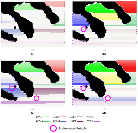 Each USV is equipped with positioning equipment, enabling real-time tracking and access to the scanning progress and trajectories of the USVs. As illustrated in Figure 3, the dotted lines indicate the boundaries of the divided areas, while the irregular shapes represent obstacles that play a role in collaborative behavior strategies. While performing the path coverage task, the USVs can identify the edge of obstacles within the detection range and perform obstacle avoidance movements. The blue solid line in Figure 3a represents the trajectory of the USV, and the red-dotted line represents the obstacle area. When the distance between the USV and the edge of the obstacle is less than the detection distance of the USV, the USV marks the edge of the obstacle.