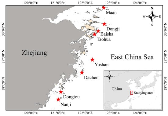 Zhejiang Province is located on the southeast coast of China, with large river systems and a subtropical monsoon humid climate. Zhejiang has over 4300 islands along the coast of the East China Sea; the surrounding waters of islands are important breeding and feeding habitats for fishery resources. Under the influence of freshwater flushing from rivers like the Yangtze River, Qiantang River, and Ou River, Zhoushan Fishing Ground, a famous fishing ground in China, has emerged. Important economic fishery species inhabit the waters surrounding islands, such as large yellow croaker (Larimichthys crocea), cuttlefish (Sepiella japonica), brown croaker (Miichthys miiuy), and blackhead seabream (Acanthopagrus schlegelii). The annual average water temperature in the surrounding waters of the islands is 16~26 °C, and the water depth is within 30 m.