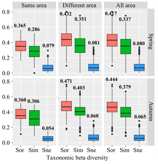 Taxonomic beta diversity of fish assemblages around islands in spring and autumn. Sor, Sim, and Sne correspond to beta diversity and its two components (turnover, nestedness), respectively. Same area: beta diversity between two sites on one island. Different area: beta diversity between two sites on two islands. All areas: beta diversity between two sites on all islands. Black bold numbers represent the mean value.