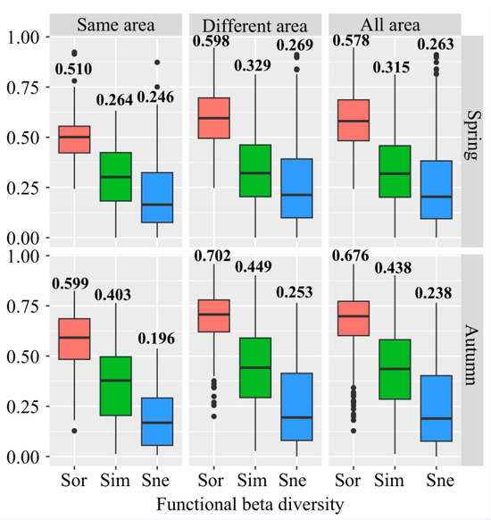 Functional beta diversity of fish assemblages around islands in spring and autumn. Sor, Sim, and Sne correspond to beta diversity and its two components (turnover, nestedness), respectively. Same area: beta diversity between two sites on one island. Different area: beta diversity between two sites on two islands. All areas: beta diversity between two sites on all islands. Black bold numbers represent the mean value.