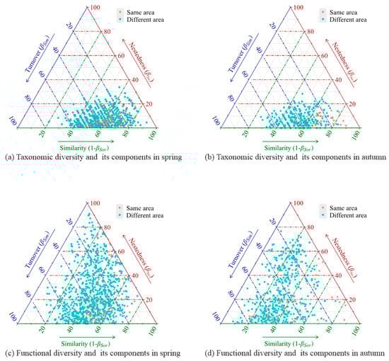 Beta diversity can add spatial components to the analysis process, focusing on changes in community compositions between different habitats, which differs significantly from alpha and gamma diversity. In addition, beta diversity can better capture the dynamic processes of biodiversity changes and guide the improvement of the rational planning of nature reserves [8]. Previous research generally proved that beta diversity can be decomposed into a combination of turnover components and nested components [9]. The former leads to a decrease in common species and an increase in unique species among different communities, while the latter results in differences in species richness between communities [2]. The ingenious decomposition of beta diversity provides a new perspective for a deeper understanding of the driving mechanisms behind the construction of communities at a spatial scale [10]. By exploring the changing process of beta diversity and its components and comprehending the contributions of the two components to beta diversity, we could better understand the ecological processes that affect the structure of communities in different ecosystems or varied regions, which is of great significance for biodiversity conservation and restoration.