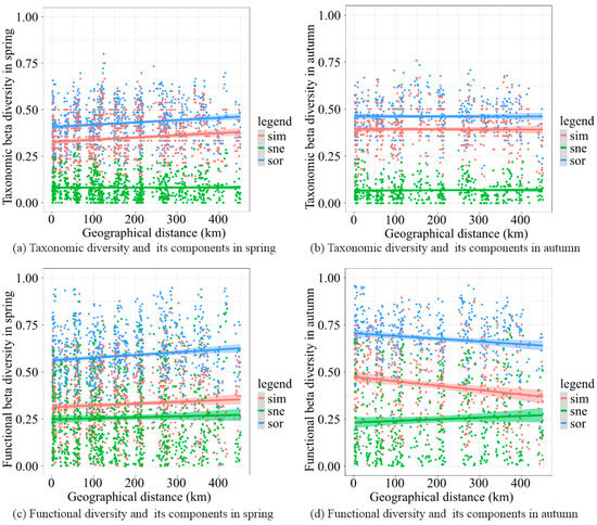 The taxonomic and functional beta diversity and its components of fish assemblages were influenced by both geographical and environmental factors. The beta diversity was mainly driven by environmental factors (mean 23%) and less affected by geographical factors (mean 12%) (Table S5). Beta diversity increased with increasing geographical distance in spring, while slight and significant downtrends (p < 0.05) were observed in autumn (Figure 5, Tables S6 and S7). The explanation ratio of environmental factors on TβSor was 10.49% and 19.77% in spring and autumn, and explained 9.02% and 17.46% for TβSim, and 3.19% and 24.64% for TβSne in two seasons (Table 1). A relatively higher explanation ratio was observed for functional beta diversity. Environmental factors explained 15.65% and 24.64% for FβSor, 9.66% and 6.86% for FβSim, and 11.46% and 14.88% for FβSne (Table 1). For taxonomic beta diversity of fish assemblages, bottom water temperature, depth, and dissolved oxygen were the most influential environmental factors in spring, while dissolved oxygen and salinity significantly affected the fish assemblages in autumn. For functional beta diversity of fish assemblages, the primary influencing factors in spring were the same as those for taxonomic beta diversity, while bottom water temperature and salinity played important roles in the assembly of fish assemblages.