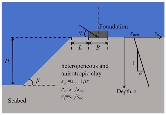 In early studies, slope soils were often simplified to homogeneous soils [9,10,11]. As research progressed, heterogeneous soil masses, where soil undrained strength increases linearly with depth, were incorporated into the scope of investigation [12,13,14]. The normally consolidated or over-consolidated clays are prevalent in the seabed and their undrained strength also increases linearly with depth [15]. Chen et al. (2022) [16] found that for shallow foundations with small embedment ratio, the bearing capacity factor increases with the increase in the homogeneity index. This study takes into account both of these soil properties.