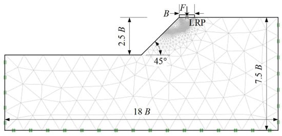 The lower bound limit analysis was conducted using the finite element software OPTUM G2 (2020) [32]. The numerical simulation incorporated a rigid foundation element with characteristic width B = 2 m. Spatial configuration was parametrized through normalized setback distance L/B, where L represents the distance from the foundation to the crest of the slope. A comprehensive parametric study was conducted across six discrete positions: 0, 0.5, 1, 1.5, 2, and 2.5. This dimensionless scheme enables generalized application across geometrically similar slope-foundation systems. The height of the slope H was set at 5 m (i.e., 2.5 times the width of the foundation), with an inclination angle β of 45 degrees. To avoid boundary effects, the considered soil slope has a width of 18 B and a height of 7.5 B. The bottom of the soil was fixed, allowing no displacement to occur, while the sides were restricted against horizontal movement (see the green symbol in Figure 2). The load reference point (LRP) was located at the center of the foundation base, and the load angle θ varies from 0° (away from the slope) to 180° (towards the slope).
