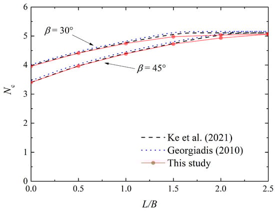 To verify the numerical model, this paper compares the undrained bearing capacity of the foundation Fu obtained from the numerical model in the previous section with the results of previous studies, considering isotropic and homogeneous soil slopes with inclination angles of 30° and 45°. The undrained bearing capacity is typically expressed in a dimensionless form as Nc = Fu/Bsuc, where Nc is also known as the bearing capacity factor.