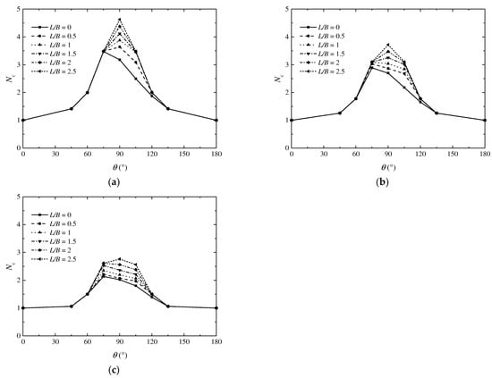 When the load angle is zero, the theoretical bearing capacity factor is always equal to 1. As the load angle increases, the bearing capacity factor also increases. When θ exceeds 45°, the bearing capacity factor increases significantly, reaching its maximum value between 75° and 90°, depending on the distance from the foundation and crest L/B. Subsequently, the bearing capacity factor continues to decrease as the loading angle increases. When θ = 180°, which is the opposite direction to θ = 0°, its bearing capacity factor is also equal to 1. When re = 1 and L/B > 1, the bearing capacities at load angles θ and 180° − θ are almost exactly equal (see Figure 5a), indicating that in these cases, the bearing capacity is independent of the slope. When re decreases, a larger L/B is required to make the bearing capacities independent of the slope.