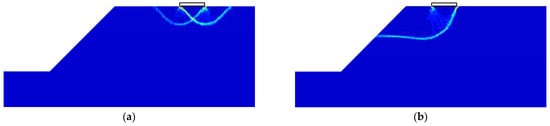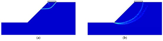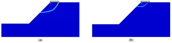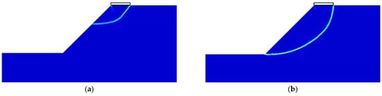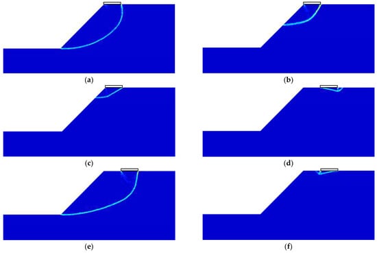 The failure modes of different heterogeneous indices ρB/suc at re = 0.8, suc/γB = 1, L/B = 0, and θ = 90° are given in Figure 6. In this study, failure modes are presented in terms of shear dissipation using a rainbow spectrum, where blue and red represent the minimum and maximum values of shear dissipation, respectively. It can be seen that for ρB/suc = 0, the shear surface extends from the back corner point of the foundation to the slope face, which is defined as face failure mode by Zhou et al. (2018) [37]. The soil below the foundation forms an active wedge region, although it is not obvious. As ρB/suc increases, the soil strength increases linearly with depth, making the shear surface shallower and the active wedge region below the foundation more pronounced.