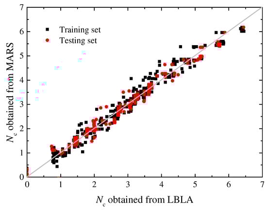 The results of the MARS analysis on the numerical model are presented, yielding an explicit empirical equation that includes 39 basis functions (including intercept). The nonlinear relationship between the five input parameters and the output is shown in Table 2. The predicted results of the MARS model were compared with the calculations from LBLA, as depicted in Figure 11. The dense scatter of points near the line of equality indicates a high degree of consistency between the MARS results and the FELA results. The training set achieves MAE, RMSE, and R2 values of 0.100, 0.153, and 0.986, respectively. In comparison, the testing set has slightly higher MAE and RMSE values of 0.112 and 0.169, with an R2 value of 0.983. This demonstrates that the MARS-based equation is an effective tool in practice.