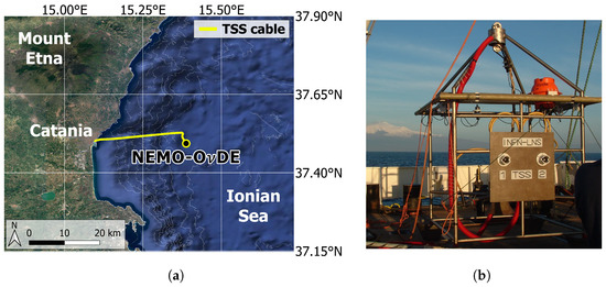 The NEMO-ODE Observatory was the first cabled acoustic system installed in the Mediterranean Sea at great depth. The main objective of the NEMO-ODE project was the long-term characterization of deep marine noise in a broad frequency band for preliminary studies on the acoustic detection of very high-energy neutrinos [32]. Installed at sea in 2005 at the Test Site South (TSS) of the Istituto Nazionale di Fisica Nucleare (INFN)—Laboratori Nazionali del Sud (LNS), about 28 km East off the coast of Catania and at a depth of 2100 m (see Figure 1a), the acoustic data acquired by the array have also been valuable for biological, geophysical, and environmental science studies.