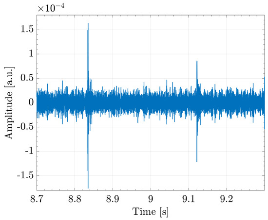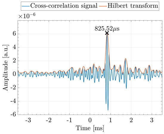 where is the signal acquired by hydrophone and is the signal acquired by hydrophone by applying a . The cross-correlation function (), as shown in Equation (1), reaches its maximum when the signals acquired by the two hydrophones are temporally aligned. The time offset () corresponding to the maximum of the cross-correlation represents the TDOA of the acoustic pulse for the hydrophone pair (). Cross-correlation is calculated for all possible hydrophone pairs. In order to improve the identification of the cross-correlation maxima, the peak is searched for at the absolute value of the Hilbert transform of the cross-correlation function (see Figure 3).