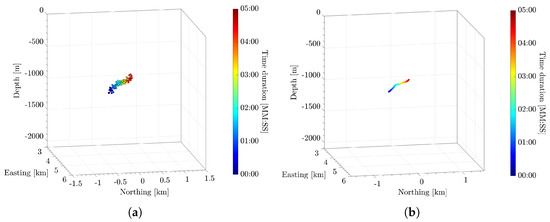 (a) Estimate of the position of a sperm whale as a function of time calculated from the acoustic recording on 8 October 2005 at 16:00. (b) The same track after applying smoothing. Time progression is indicated by the color scale.