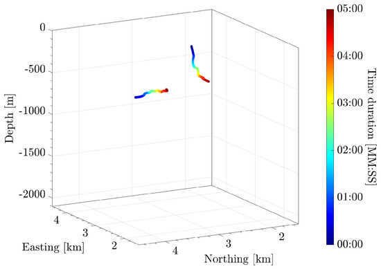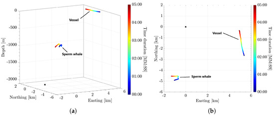 The direction of arrival for each pulse is calculated independently. The search for the reflected signal associated with each click was conducted by analyzing all subsequent clicks that met the criteria listed above and had a time delay relative to the direct signal compatible with the system’s geometry. Only pulses with a delay differing from the expected value by less than 500 ms, assuming an isovelocity profile at 1515 m/s, were considered in the search for reflected signals. This ensures that the reflected signal is correctly associated to its direct signal without ambiguity. Once the pairs of direct and reflected signals are identified, the whale’s position can be calculated for each click, allowing its movement to be tracked during the 5-min recording. No assumptions were made a priori on the number of emitting sources (i.e., whales). The positions are plotted in 3D with a color scale indicating time progression (see Figure 5a).