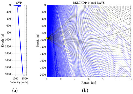 (a) Generic Sound Velocity Profile (SVP) acquired in the study area. (b) BELLHOP ray tracing from an acoustic source at a depth of 950 m (yellow dot), referring to the same SVP.