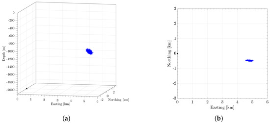 Distribution of positions obtained from the Monte Carlo simulation (blue dots—1000 entries) using the same TDOA measurements, accounting for uncertainties in hydrophone positions, TDOA measurements, sound velocity profile, and station depth. The black asterisk indicates the NEMO-ODE station. (a) 3D view and (b) top view.