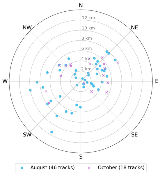 The tracking algorithm relied on identification of both direct and reflected clicks. However, reflections were often attenuated or deviated due to refraction, especially when the whale was far from the station. Therefore, tracking success diminished with increased distance, though the algorithm was able to track whales up to 12 km away, covering an area of around 450 km2. When it was not possible to identify the signals reflected from the surface but only the direct ones, the algorithm still estimated the maximum distance of the sperm whale from the station. To study the distribution of animals in the study area, the average position for each track was calculated. In Figure 9, a top view of the average positions of the animals for all the dives acoustically reconstructed by the algorithm is shown. The figure reports the directions and the horizontal distances of the animals with respect to the NEMO-ODE position in August (blue dots) and October (red crosses).