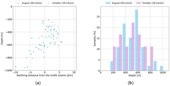 (a) Sperm whale average depth as a function of the northing distance from the station in August (blue dots and October (red cross). (b) Histogram of the average depths reached by the sperm whales (resolution 100 m).