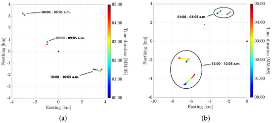 Traces calculated from different recordings. The black asterisk indicates the position of the NEMO-ODE station. (a) Recordings on 9 August 2005 between 8:00 a.m. and 10:05 a.m. (b) Recordings on 14 October 2005 between 12:00 a.m. and 01:05 p.m. Time progression is indicated by the color scale.