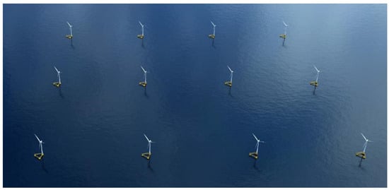 In summary, in a tropical cyclone environment, the FOWTs’ mooring systems requiring a 3 × 3 pattern and a large anchor radius (i.e., mooring scope) may be crowded among each other. As long as the turbine array is properly arranged, the FOWTs can be fitted in a limited area and achieve a high power generation rate that meets the regulatory requirement of 7.0 MW/km2. The anchor radius of m used in this study barely works; it should be shortened to allow an easier and better routing for the power cable.