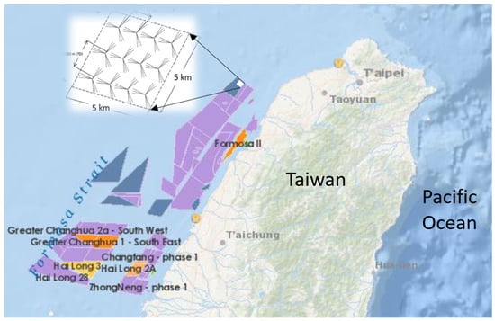 Example layout for accommodating 12 FOWTs in a small wind farm block. Taiwan Offshore Wind Map adapted from https://map.4coffshore.com/offshorewind/ (accessed on 17 January 2025).