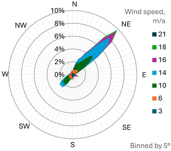 Wind rose in the Taiwan Strait near Hsinchu. Obtained based on 4 years of buoy measurements courtesy of https://nodass.namr.gov.tw/gis/#/method/Observation/station/cwa (accessed on 17 January 2025).