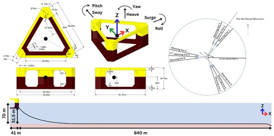 The extreme current velocity (surface current speed at 1.57 m/s), extreme wind speed (57 m/s at hub height), and extreme wave significant height have already been taken into account during the design of the mooring system, with the offset being limited to stay under 32% of the water depth, which is 22.4 m [34]. Furthermore, Wu et al. [35] pointed out that during the winter, the northward current weakens even more as the northeasterly monsoon strengthens, so the sea current does not significantly impact the mooring system. Given the extreme environment in a typhoon region, the FOWT’s mooring system requires nine catenary chains in a 3 × 3 pattern. The 3 × 3 system, rather than a 3 × 2 or 3 × 1, is needed to satisfy the strength requirement in mooring codes and standards [2,34], where a safety factor of 1.67 in intact condition is typically specified to be met for a 50-year environmental condition. Details of the mooring design can be found in another paper [34]. The ground chain is 12 times the water depth (12 WD), which may be slightly longer than those in typical shallow-water mooring designs [2]. The long ground chain improves the mooring performance in typhoon conditions [34]. The distance between two turbines is also adjusted to ensure that the mooring lines are adequately spaced to prevent crossing and clashing between two mooring systems.