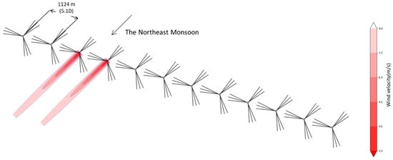 While this linear layout is theoretically feasible for a 12-turbine wind farm, its practicality diminishes as the scale of the wind farm increases. Most wind farms are in the shape of blocks. Larger-scale wind farms require significantly more space, making them difficult to implement in the narrow and elongated geographic conditions of the Taiwan Strait. For example, accommodating 50 turbines with the same spacing would demand an expansive area, which is often unavailable or economically unviable in the region.