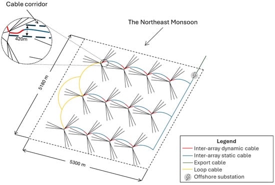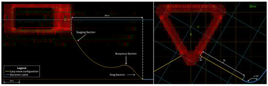 The power cable system is another issue. A power cable system needs to be arranged to fit into the layout, which is crowded by the 3 × 3 mooring patterns. Note that power cables are not allowed to go under the mooring lines. The cable corridor needs to accommodate not just the inter-array cables but also a lazy wave configuration for each FOWT. There are many possible cable configurations [38]; here, a conventional dynamic–static–dynamic approach is used, with the dynamic cable in the lazy-wave configuration [39,40]. Fully suspended inter-array cables have also been investigated in Taiwan, which might be another alternative depending on the cables available [38]. Cable properties from a manufacturer might influence this choice a lot [41], but none are offered in Taiwan at the moment. Figure 8 illustrates the lazy-wave configuration of TaidaFloat. There shall be a buffer zone between the cables and mooring lines. According to the EirGrid 220 kV Submarine Cables Function Specification, the width of the cable corridor must be at least 100 m or six times the water depth, whichever is greater [42]. As the wind farm is composed of three rows of FOWTs, each row could use a backup loop cable if any of the row is damaged. On the east border of the farm, a large export cable can be placed to gather the power generated by the three rows of FOWTs, as demonstrated in Figure 9. Note that all the cables are supposed to be kept within the limited area of the small farm. It can be seen that the cable routing may be possible, but may be challenging to arrange in the crowded area.