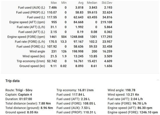 This vessel, detailed in Table 1, operates a nine nautical mile (NM) route in the Baltic Sea between the Estonian islands of Hiiuma (Sõru Harbor) and Saaremaa (Triigi Harbor). The data, which include fuel consumption, engine load (both AFT and FORE), the distance travelled, speed, and wind conditions, were collected between June 2022 and September 2024. The selected route for comparison was Sõru to Triigi, chosen to assess the impact of wind on fuel consumption. Reversing the route would alter the wind effects, complicating the comparison. The ferry is operated by four different captains, who work in two-captain shifts for two weeks each, ensuring continuous and varied operational data. This operational structure provides a range of practices that can be analyzed to study the effects of human factors on fuel efficiency [31].