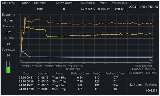 Data for this study were obtained from the Vessmon (v. 300-05.000.01) Energy Monitoring System (EMS) data from the double-ended ferry MV Soela. This system was developed and installed by the Estonian shipbuilder Baltic Workboats (Nasva Harbor, Saaremaa, Estonia). The platform is integrated, collecting and analyzing real-time data (see Figure 1) using multiple variables and inputs. It monitors fuel flow, engine load, and environmental conditions to compile and assess high-resolution energy usage profiles for each subsystem. Additionally, performance alerts are recorded to improve the system’s analysis.