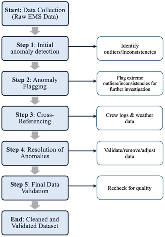 To ensure accuracy of the data, these data first underwent a validation process as shown in Figure 3. Outliers were detected and removed, and inconsistencies in vessel speed and fuel consumption were flagged. After flagging the outliers and inconsistencies, the remaining dataset was then compared to manual crew logs and weather data to verify variables such as wind speed and directions, and environmental conditions. This is an important step when working with large maritime datasets [32]. Following the cross-referencing of data, anomalies were resolved through a systematic process of data removal, correction, and verification. Inconsistencies in vessel performance metrics were adjusted, and wind and environmental data were aligned with recorded observations. Additionally, discrepancies in timestamps and sensor readings were corrected to maintain consistency across all data points. The dataset was then rechecked for correctness before resulting in a cleaned and validated dataset for detailed analysis.