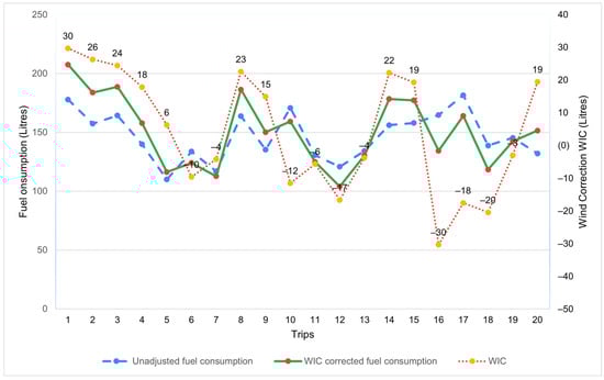 Within this study, the regression model incorporated variables such as wind speed and direction, operational practices, and engine load to provide a more detailed analysis of factors influencing fuel consumption. We developed two regression models to allow for a more in-depth analysis. First, an unadjusted model, referring to straightforward fuel consumption without comparisons to wind conditions; and second, a corrected model, with comparisons to wind speed, angle and direction. This second model required an assessment of as many factors that may affect fuel consumption as possible. The corrected model showed that there was some variation in the fuel consumption adjustments as seen in Figure 4. For example, in headwind conditions, the corrected consumption values were higher by as much as 30 L. Alternatively, when tail winds were used, the corrected values were lower by as much as 30 L. Nevertheless, when it came to the general impact of the correction on the dataset, the impact was rather faint. The average fuel consumption of the dataset was lower by 1.62% from 140.6 L to 138.4 L.
