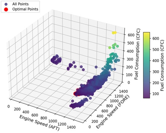 The highlighted red points represent the most fuel-efficient operation ranges where fuel consumption is at its lowest. These points correspond to specific AFT and FORE engine speed ratios that minimize fuel usage. The red points are positioned in the lower section of the Z-axis and form a cluster, indicating that the optimal fuel consumption is achieved at moderate engine speed levels for both the AFT and FORE engines. This clustering provides valuable insights for operators to identify the ideal RPM ranges that enhance fuel efficiency. In contrast, the yellow points, which represent higher fuel consumption, are positioned further along the Z-axis, illustrating that increased RPMs result in higher fuel consumption. The non-optimal zones can be avoided during regular vessel operations to improve fuel economy. This visualization technique enables the identification of optimal engine speed ratios and is commonly used in maritime research. To facilitate data analysis and visualization, the following libraries were employed: