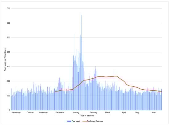 An important aspect of this study is the evaluation of engine load management, and particularly, the most optimal usage of the AFT and FORE engines in hybrid systems. The findings indicate that effectively managing both engines simultaneously, and ensuring proper load distribution, significantly reduces the fuel consumption. The results suggest that vessel operators avoid shutting off the FORE engine, as doing so negatively impacts fuel efficiency. To enhance the regression models, an additional variable was introduced to account for winter months (December to February), improving model accuracy, and capturing the seasonal effects on fuel consumption. This indicates the impact of factors on fuel consumption trends. Adverse weather conditions, including high winds and low temperatures, have been seen to increase resistance and propulsion demands, and therefore fuel consumption [10]. In comparison to the results illustrated in Figure 6, where seasonal consumption seems to be greater in winter, our linear regression analyses (refer to Table 4 and Table 5) suggest that the average difference is only around 35 to 36 L more fuel utilized per trip in freezing settings. This “winter penalty” while insignificant is understated, highlighting the fact that working under low temperature conditions requires extra energy.