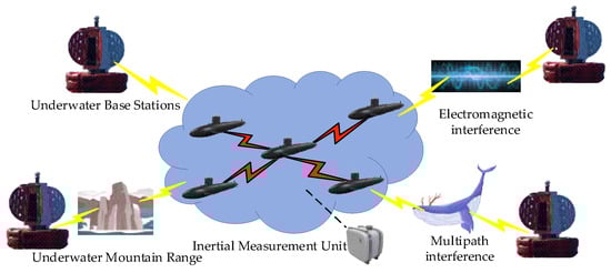 With the rapid development of human science and technology, the utilization capability of marine resources has significantly improved. Unmanned underwater vehicles (UUVs) have become core equipment in fields such as marine exploration, resource development, and environmental monitoring due to their convenience and safety [1,2,3]. However, a single underwater vehicle is no longer able to meet the practical requirements of marine resource development due to limitations in endurance range and detection device coverage [4]. Therefore, the main direction of development is to form clusters of UUVs. In UUV clusters, the relative cooperative positioning among UUVs is the fundamental basis for UUV cluster applications. However, factors such as underwater mountains obstructing signals, underwater signal attenuation characteristics, multipath effects, and other factors result in low real-time positioning accuracy for UUV clusters. Additionally, existing cooperative positioning technologies require stable networks and cannot meet the requirements for the free aggregation and dispersion of UUV clusters [5]. Therefore, it is imperative to develop UUV cluster cooperative positioning with high real-time performance and free aggregation capability.