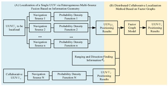 As depicted in Figure 2, the architecture comprises two core components: (1) information geometry-based heterogeneous multi-source fusion for individual UUVs and (2) factor graph-based distributed collaborative localization. For each UUV within the cluster, the proposed method first converts positioning information from diverse navigation sources into probabilistic density functions in information geometry space, achieving effective unification of heterogeneous navigation parameter formats to establish a foundation for subsequent fusion. Through information geometry-based multi-source fusion, reliable positioning information for each UUV is generated, serving as the basis for distributed collaborative localization. Leveraging abundant ranging and bearing measurements within the UUV network, we construct a factor graph representation of the swarm, facilitating effective propagation and fusion of localization information among UUVs. This ultimately achieves distributed collaborative positioning for the entire cluster. The procedural flowchart of the distributed UUV swarm factor graph model is presented in Figure 3.