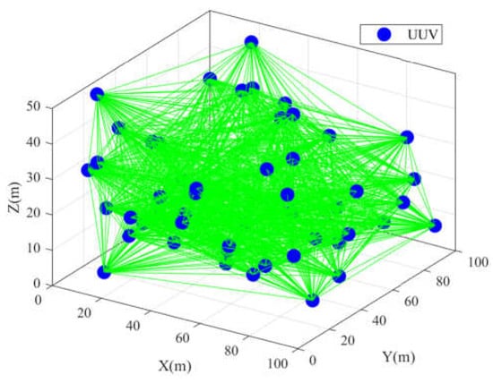 The simulation parameters of this paper are shown in Table 1. To ensure ranging accuracy, communication and ranging between UUVs within the collaborative network area are in a fully connected state. UUVs are randomly distributed in three-dimensional space, and the network topology is shown in Figure 7. In the figure, blue solid circles represent UUVs, and communication between UUVs is indicated by green lines.
