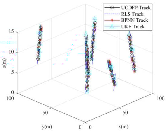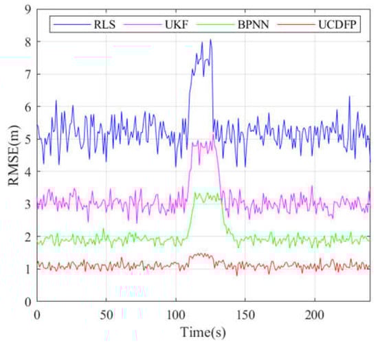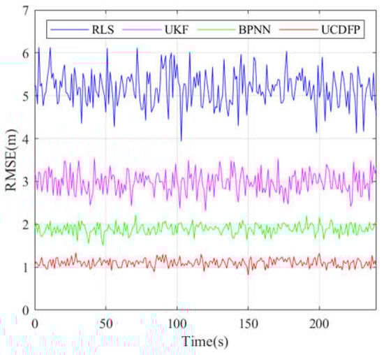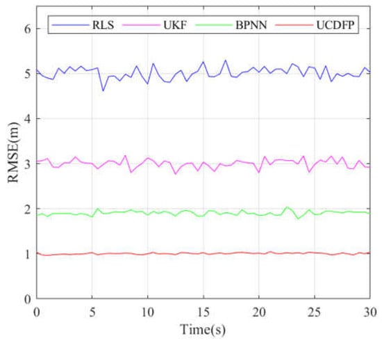 In Figure 15, the symbol “o” is used to represent the positioning results obtained using our method. Upon examination of the data presented, it becomes clear that the positioning outcomes for the unmanned underwater vehicle (UUV) that employs the UCDFP method are in close proximity to the actual values, indicating high accuracy. To further substantiate the effectiveness and reliability of the UCDFP method, we conducted a comparative analysis with other well-established methods, namely the Recursive Least Squares (RLS) method, the Unscented Kalman Filter (UKF), and the Back Propagation Neural Network (BPNN) method. Figure 5, Figure 6, Figure 7, Figure 8, Figure 9, Figure 10, Figure 11, Figure 12, Figure 13, Figure 14 and Figure 15 illustrate the positioning errors observed for the UUV when different positioning methods are utilized. The figures demonstrate that, in the absence of sudden error fluctuations, the RLS and UKF methods exhibit the largest positioning errors, indicating significant deviations from the true values. The BPNN method shows intermediate levels of error. In contrast, the UCDFP method consistently demonstrates the smallest positioning errors among all the methods evaluated. This outcome clearly indicates that, compared to the other three methods, the UCDFP method provides significantly higher positioning accuracy under normal operational conditions. Such a performance advantage highlights the potential of the UCDFP method as a superior choice for precise and reliable positioning in underwater navigation applications.