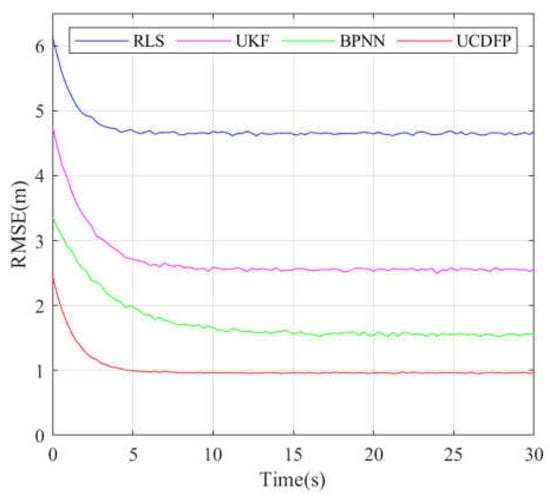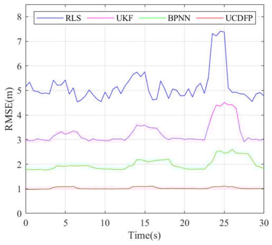 Subsequently, we will compare the performance of four multi-source fusion positioning methods, RLS, UKF, BPNN, and UCDFP, under sudden-change scenarios to verify the advantages of the UCDFP method in the field of UUV positioning. The setup involves adjusting the pseudo-range error standard deviation, r1, from 1.0 m to 1.5 m during the time interval t = 3~7 s; the underwater base station ranging error standard deviation, r2, changes from 1.0 m to 2.0 m during t = 13~17 s; and the inter-UUV ranging error standard deviation, r3, changes from 1.0 m to 2.0 m during t = 23~27 s. Other parameter settings remain consistent with the ideal scenario. This experiment uses the average positioning error of 50 UUVs as the output metric. The simulation results for the accuracy comparison of multi-source fusion positioning methods under sudden-change scenarios are shown in Figure 12.