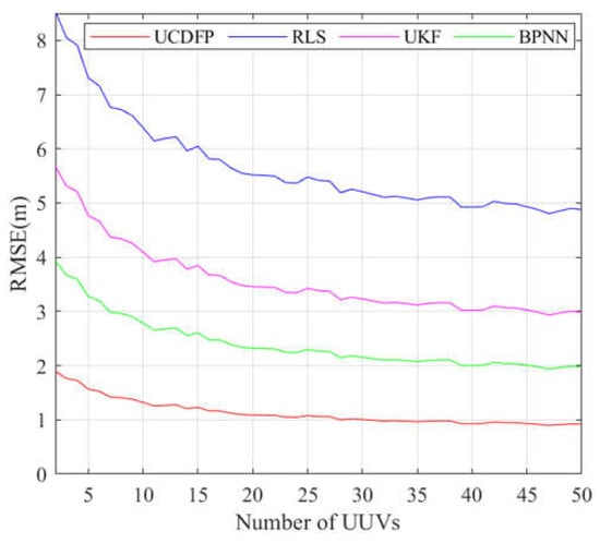 As depicted in Figure 11, during the real-world underwater operations of unmanned underwater vehicles (UUVs), the localization error of the UUV swarm undergoes significant variations in correspondence with the periodic changes in the number of units within the swarm. Specifically, the UCDFP (unmanned cluster dynamic fusion positioning) method proposed in this study showcases remarkably superior performance in managing these variations. The amplitude of change in the localization error for the UCDFP method is the smallest, measuring approximately only 0.3 m. This result highlights the capability of the UCDFP method to maintain a relatively stable level of localization accuracy across UUV swarms of different sizes. In stark contrast, the other three methods evaluated, namely, the Recursive Least Squares (RLS), Unscented Kalman Filter (UKF), and Back Propagation Neural Network (BPNN) methods, exhibit relatively larger changes in localization error. When these methods are confronted with variations in swarm size, the extent of fluctuation in their localization errors is notably higher compared to the UCDFP method. This suggests that the UCDFP method is not only more robust but also more reliable in preserving localization accuracy amid dynamic changes in UUV swarm sizes, making it a more effective approach for UUV operations that involve variable swarm configurations. The results are shown in Table 4. The ability of UCDFP to deliver consistent performance regardless of the swarm scale underscores its potential as a highly preferred technique in the field, as it ensures precise navigation and operation in diverse scenarios.