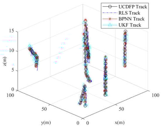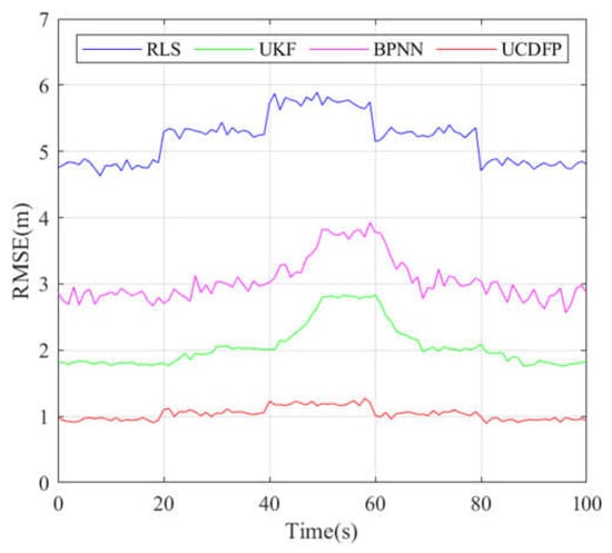 This section will provide a systematic performance comparison of four positioning methods, specifically including the Recursive Least Squares (RLS) method, Unscented Kalman Filter (UKF), Back Propagation Neural Networks (BPNNs), and the unmanned underwater vehicle cooperative fusion positioning method based on information geometry (UCDFP). To ensure the reliability and validity of the comparison results, we conducted experiments in a real-world pool environment, with the experimental results shown in Figure 16. During the experiments, we assessed the positioning accuracy and robustness of these four methods under different interference conditions. The goal was to gain a comprehensive understanding of the performance of each method.