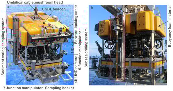 Figure 1. The primary components of the Haima ROV platform and its mission payload. (a) The front view of the Haima ROV displays critical operational modules, including the sediment sampling system, manipulator arms, high-definition cameras, and forward-looking sonar. (b) The lateral view displays specialized subsea tools such as the seabed drilling system.