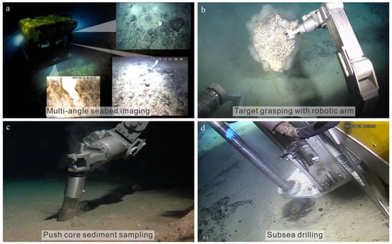 During seabed transects or stationary observation, the ROV video recording system utilizes multiple cameras for environmental documentation (Figure 2a). A wide-angle camera enables large-FOV target reconnaissance, while a high-definition zoom camera (1080i resolution) with a pan-tilt mechanism (±360° azimuth, ±90° elevation) supports multi-angle close-range inspections [41]. An ultra-high-definition (4K) camera captures fine structural details. Upon identifying CRCs via video or forward-looking sonar, the ROV executes a precision landing for sampling operations. Gravelly crusts are directly collected using manipulators and stored in sample baskets for surface retrieval (Figure 2b). For sedimentary substrates, either manipulator-operated push core samplers (Figure 2c) or ROV-mounted sediment sampling systems are used. Tabular crust sampling is performed with a 1.5 m seabed drill rig integrated into the ROV (Figure 2d).