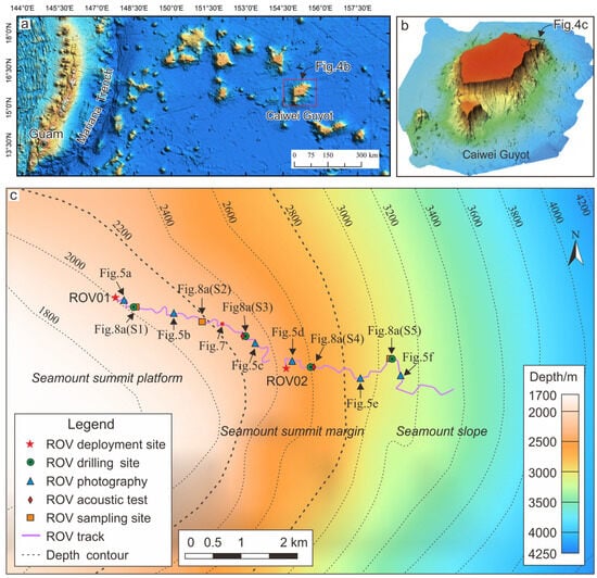 The Caiwei Guyot (14.9–16.1° N, 154.4–156° E), located east of Guam and the Mariana Trench within the Pacific Prime Crust Zone (PPCZ), extends 110 km in length and 95 km in width with a northeast-trending distribution. Its geomorphology consists of flat-topped summits and steep upper slopes transitioning to gentler lower slopes [46]. As a designated cobalt-rich ferromanganese crust exploration area, China has conducted extensive investigations, including bathymetric mapping, deep-sea drilling, and sub-bottom profiling. Exploration results indicate thick CRCs on the slopes of the Caiwei Guyot [47,48]. This paper presents a comprehensive ROV survey of Caiwei Guyot as a case study, detailing the data collection process.