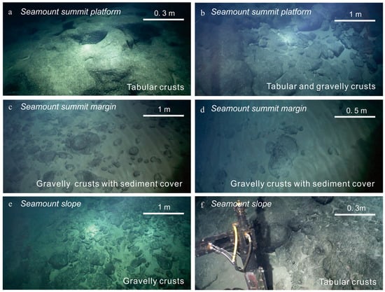 Figure 5. Crust development characteristics across distinct seamount zones based on ROV subsea observations. (a,b) The summit platform is dominated by continuous tabular crusts with associated gravelly crusts. (c,d) The margin primarily features gravelly crusts that are partially covered by thin sediment layers. (e,f) Along the seamount slope, both gravelly and tabular crusts are observed.