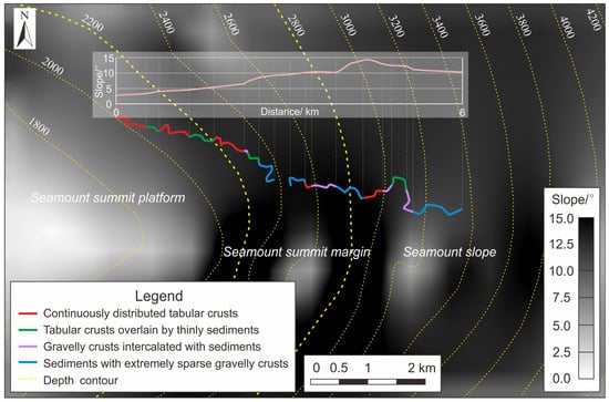 Notably, continuous and partially sediment-covered tabular crusts predominantly occurred on the summit platform with gentle slopes of 3–5° (red and green segments in Figure 6). In contrast, gravelly crusts dominated steeper slopes: 5–10° at the seamount margin and 12–15° on the slope (purple segments in Figure 6), highlighting slope-dependent crust differentiation.