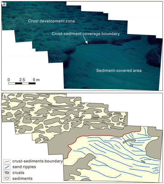 Figure 7. 3D mosaic imagery revealing fine-scale crust distribution on seamount slopes. (a) displays ROV-derived 3D mosaic images, while (b) provides interpretive annotations. The corresponding location is mapped in Figure 4c. The mosaics delineate sediment zones, crust development zones, and transitional boundaries, with sediment ripple features suggesting bottom currents may influence crust growth.