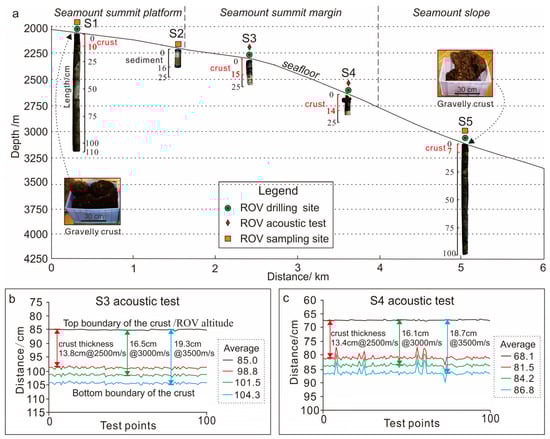 Figure 8. Samples were collected during ROV submersible dives and in situ acoustic crust testing results. (a) Core samples from S1 and S3–S5 indicate crust thicknesses ranging from 7–15 cm. Bulk gravelly crusts retrieved at S1 and S5 confirm the coexistence of gravelly and tabular crusts on the summit platform and slope. (b,c) show in situ acoustic-derived crust thickness measurements at Sites S3 and S4, respectively, demonstrating strong consistency with core-based data.